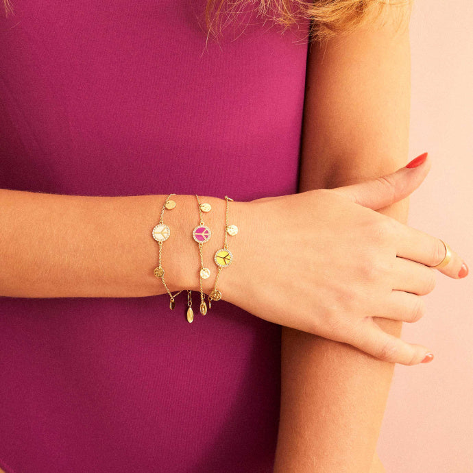 Matière: • 0,05 microns 14k fine gold plated brass chains, clasp and charms. • Enamel, strasses.