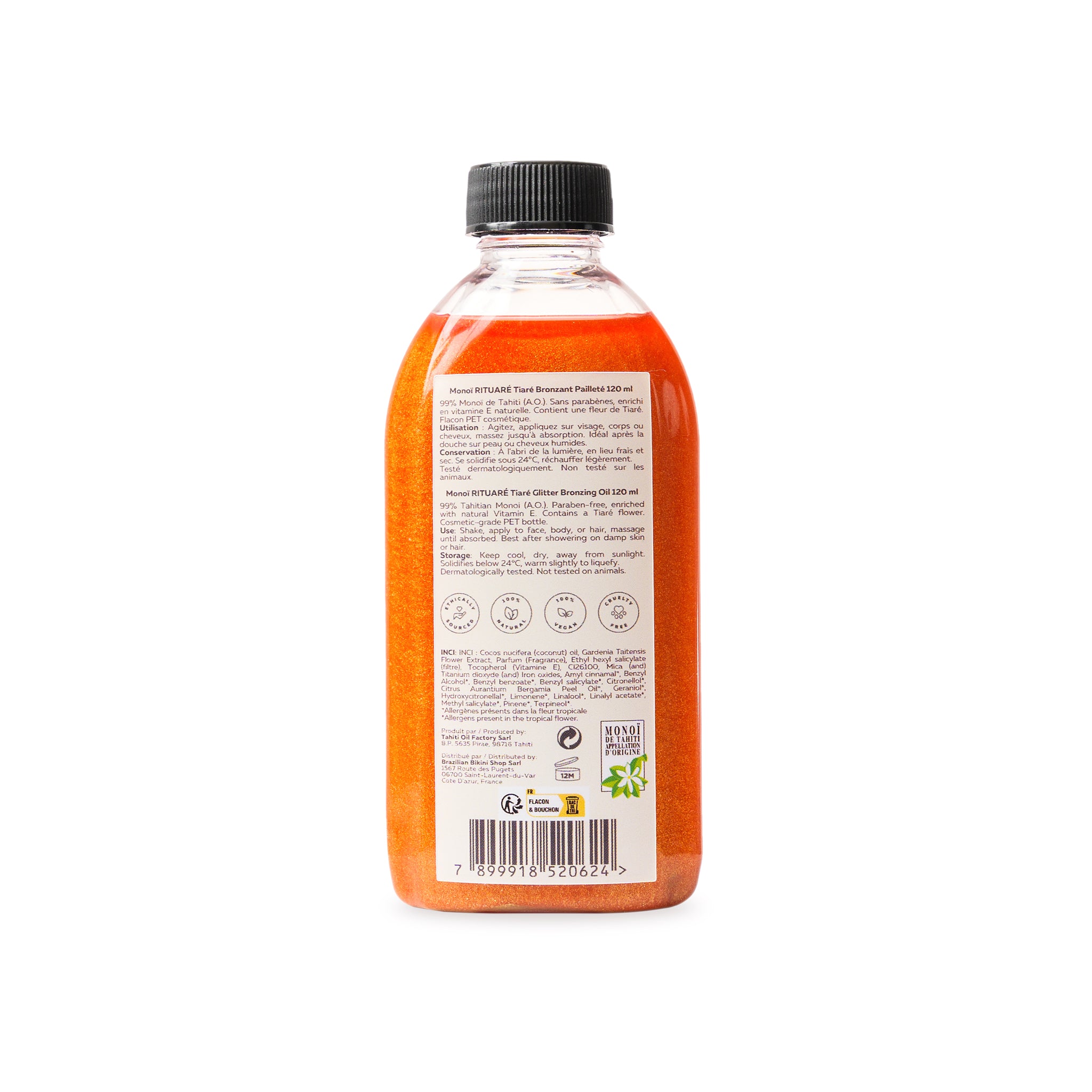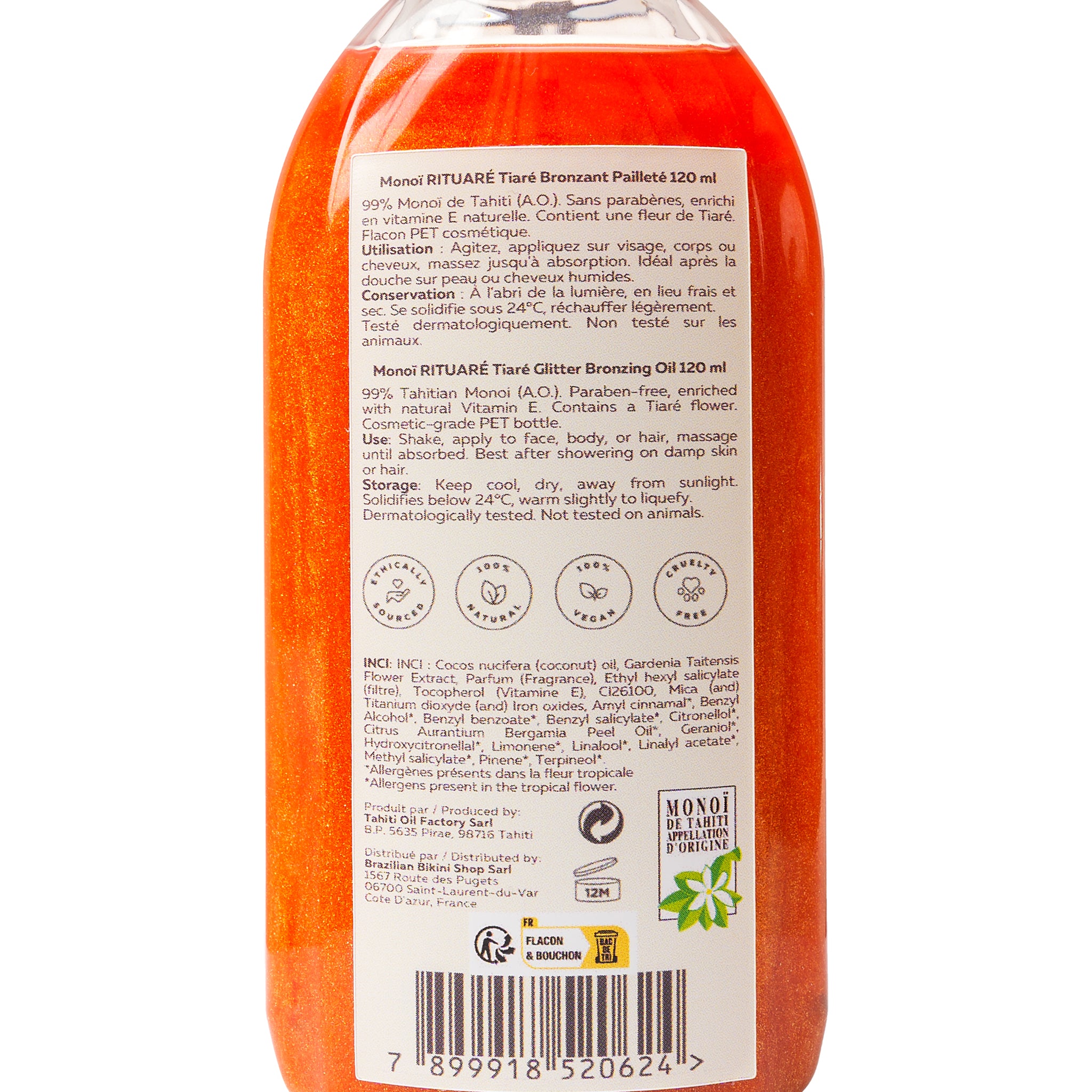 • Matière: 99 % de Monoï de Tahiti Appellation d'Origine ECOCERT COSMOS. Cocos nucifera oil, Gardenia tahitensis, Parfum, Tocopherol. Paraben-free.