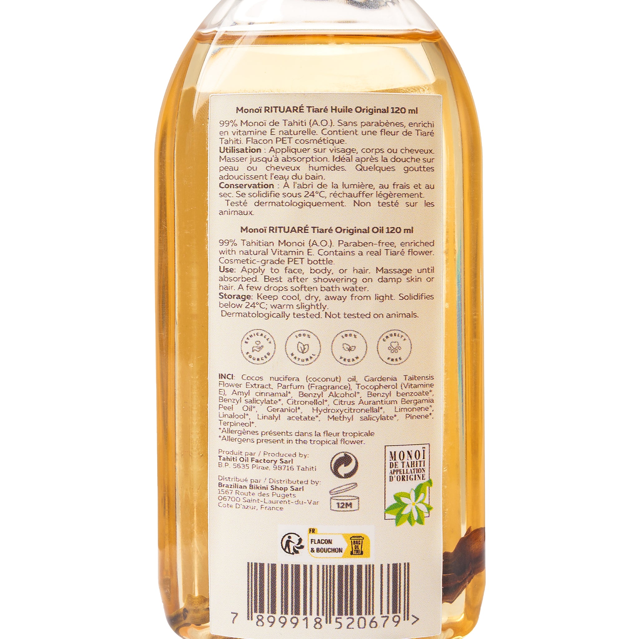 • Matière: 99 % de Monoï de Tahiti Appellation d'Origine. Cocos nucifera (coconut) oil, Gardenia Taitensis Flower Extract, Parfum (Fragrance), Tocopherol (Vitamine E), Amyl cinnamal, Benzyl Alcohol, Benzyl benzoate, Benzyl salicylate, Citronellol, Citrus Aurant