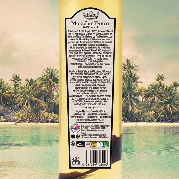 - Matière: 100% Monoï de Tahiti Appellation d'Origine 100 % naturel. Sans colorant. Sans filtre solaire. Non testée sur les animaux. Une fleur de Tiaré dans ce flacon. Sans colorant. Avec un conservateur naturel. Coco nucifera (coconut) oil, Gardenia tahitenti