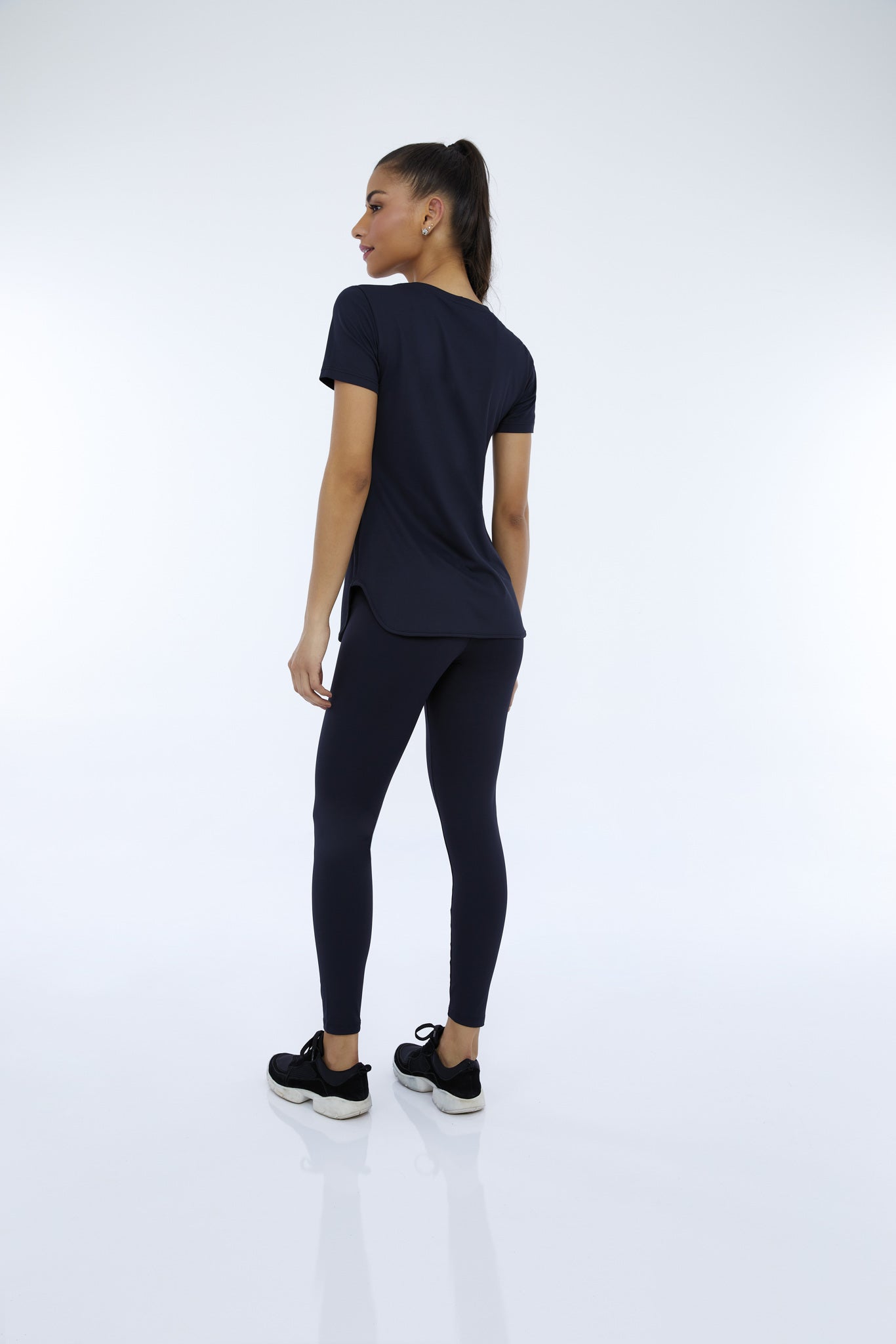Model Front: Alto Giro Fitness Haut T-Shirt Skin Fit Alongada Gola V Preto