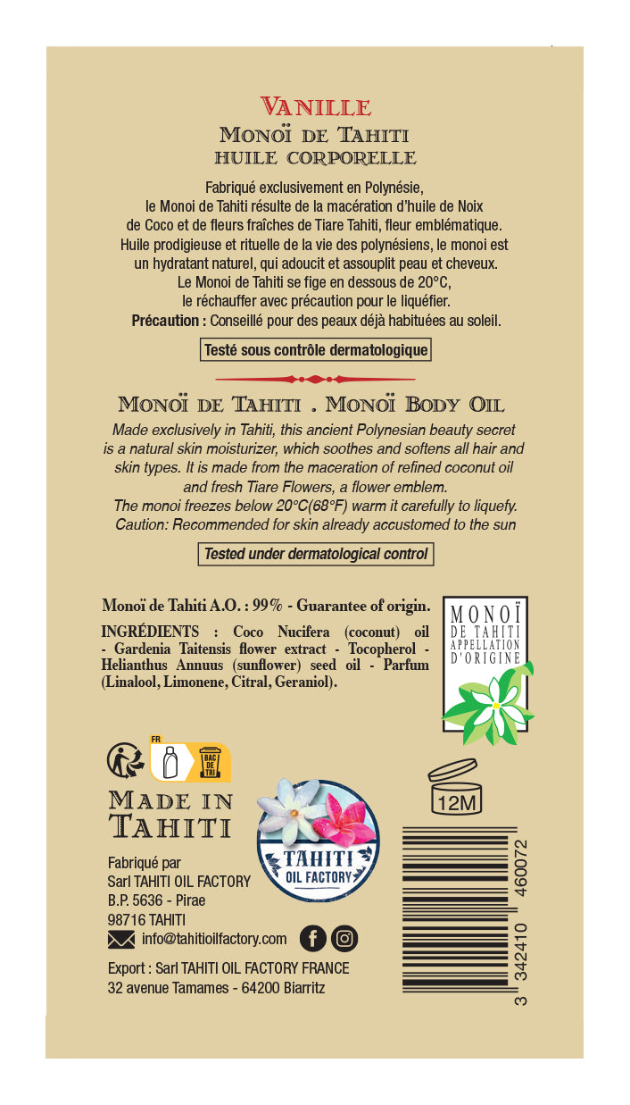 • Matière: 98% Monoi de Tahiti, Designation of Origin (Appellation of Origin). Contains neither colourants nor sunscreen
